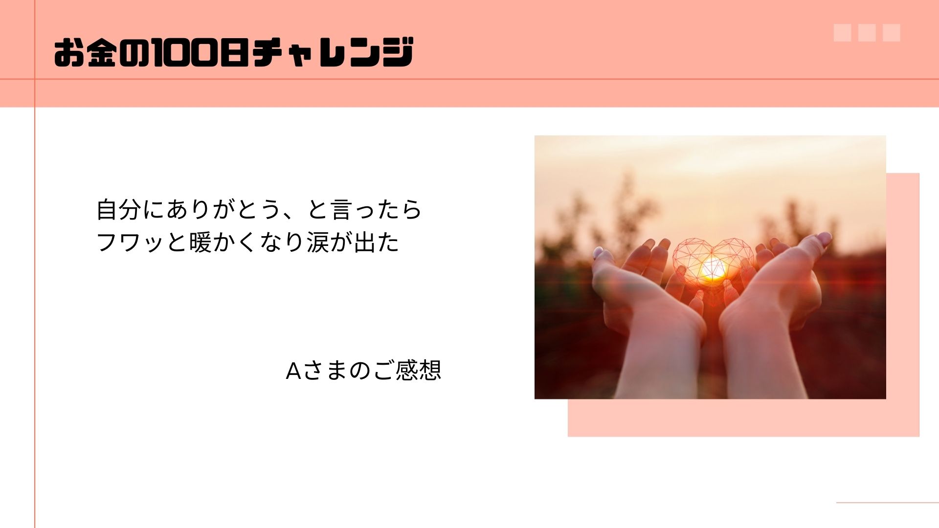 自分にありがとうと言ったらフワッと暖かくなり涙が出た【ご感想⑦お金の100日チャレンジ・A様】